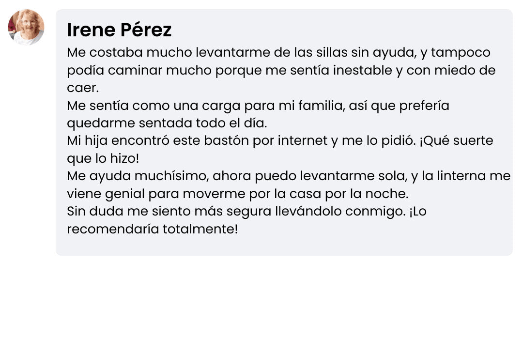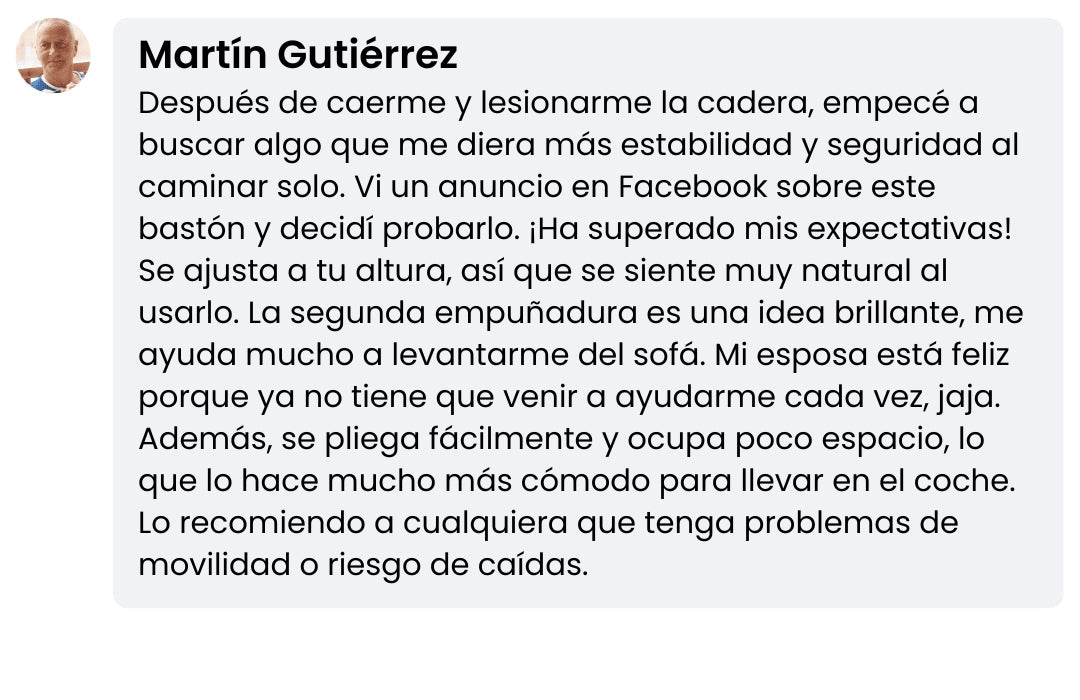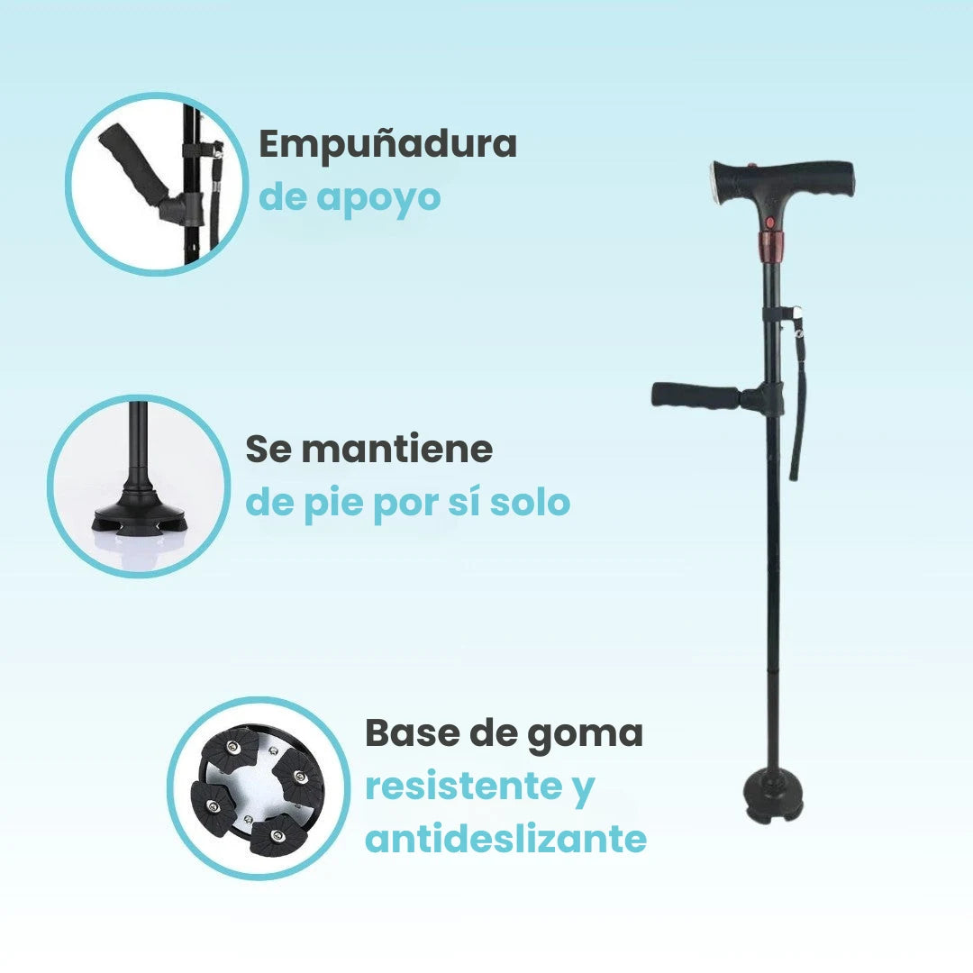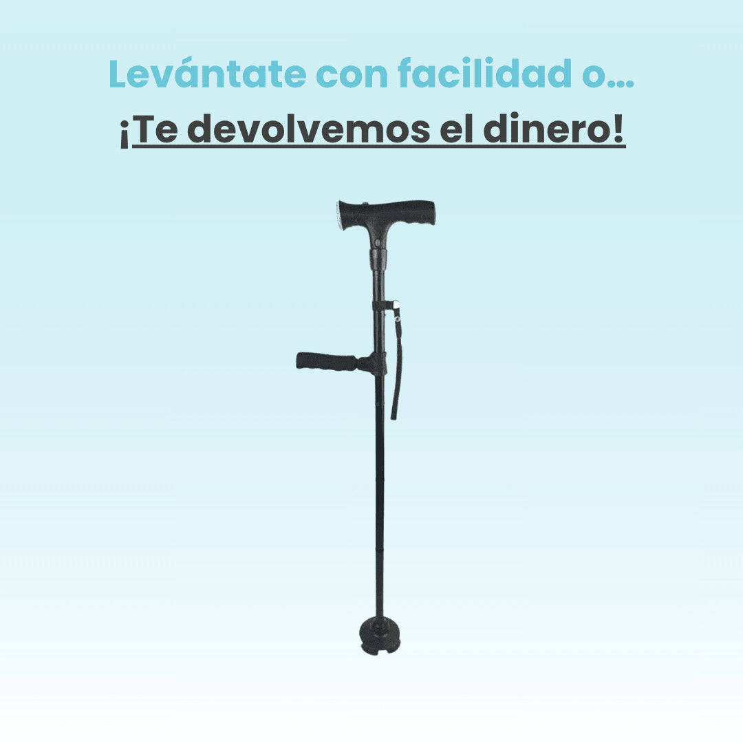 A diferencia de los bastones tradicionales, TeraApoyo cuenta con un doble agarre ergonómico que ofrece un nivel extra de soporte, facilitando que puedas incorporarte desde sofás, sillas o cualquier posición sentada sin necesidad de ayuda.